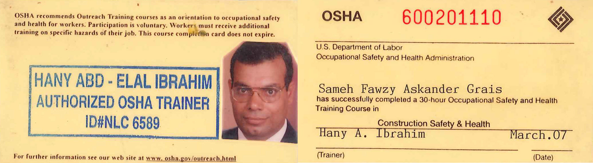 USA – OSHA General Course #511, USA – OSHA Construction Course #510 - American University (Jul. 2007)