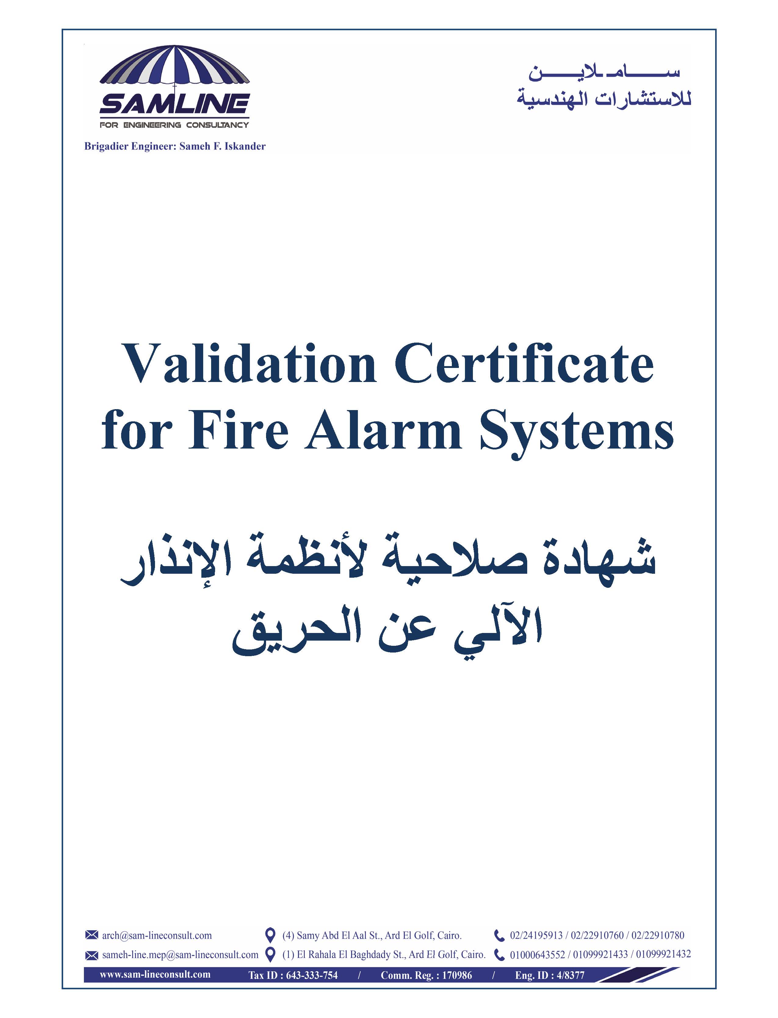 1- Design all fire Alarm systems as following: • Preparing design drawings. • Preparing bill of quantities. • Preparing terms & technical specifications & tender documents. 2- Supervising the installation on site & regular visits to the site. 3- Receive works & supervise testing fire networks. 4- Preparing validity certificates for fire alarm systems. 5- Regular maintenance and supply of the original spare parts. 6- Inspect the systems installed on the site, determine their suitability and efficiency for work and issue a technical report accordingly.